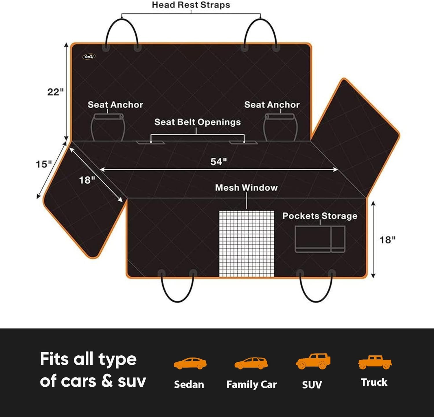 MESH VIEWING WINDOW & STORAGE POCKET & DOG SEAT BELT: YoGi Prime dog car seat cover has a mesh window barrier that allows the pet and you to see each other easily for safer driving. Extra pocket design made for simple storing of your dog’s toys or food. Included is the adjustable dog seat belt which keeps your pet on the seat.