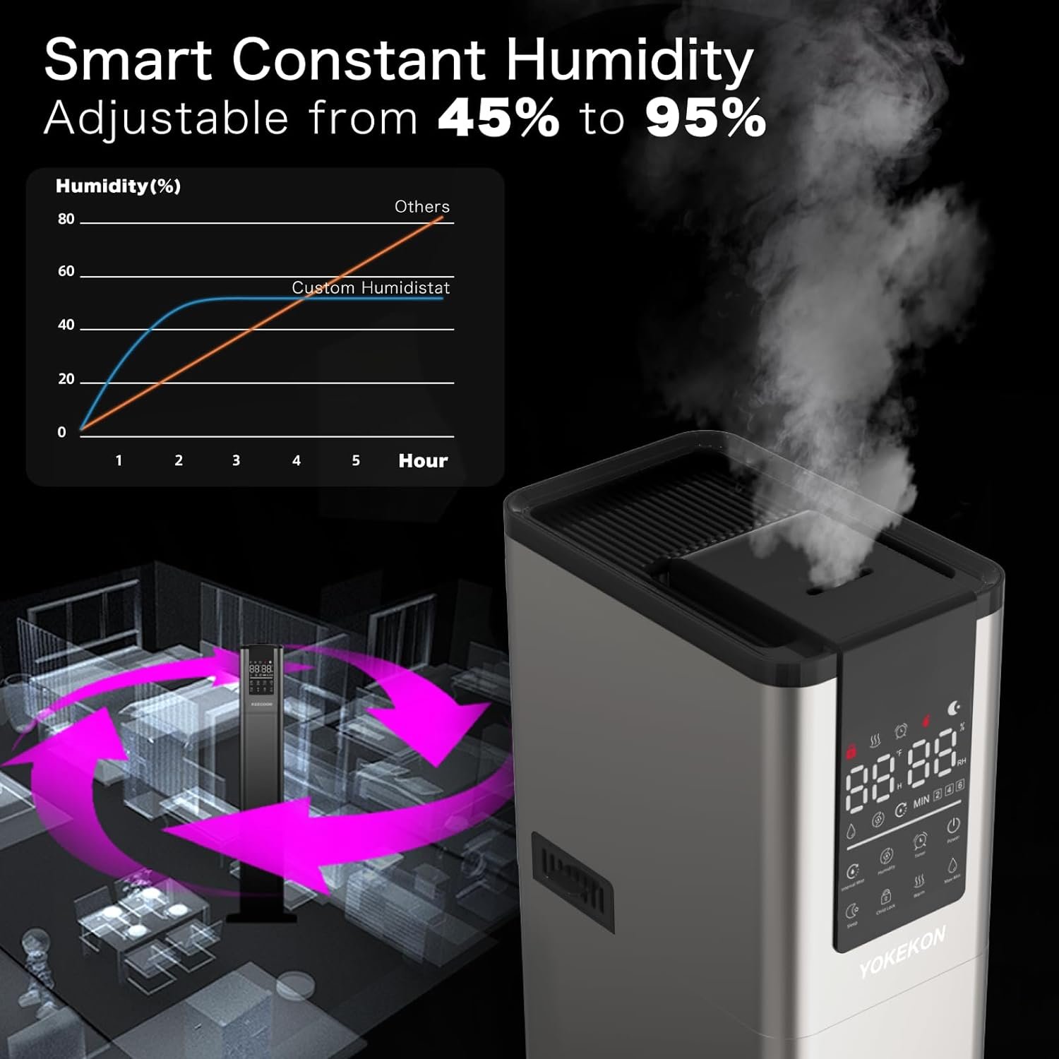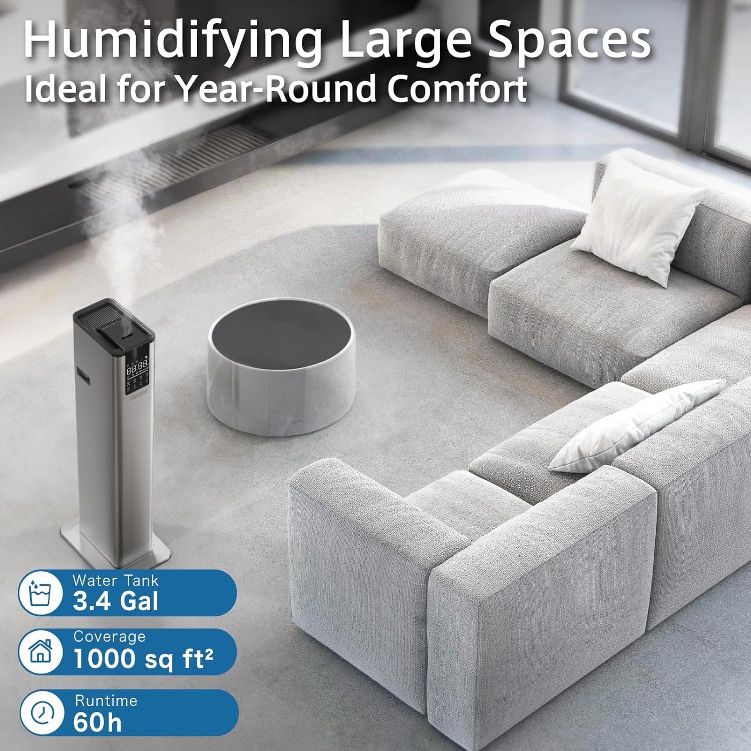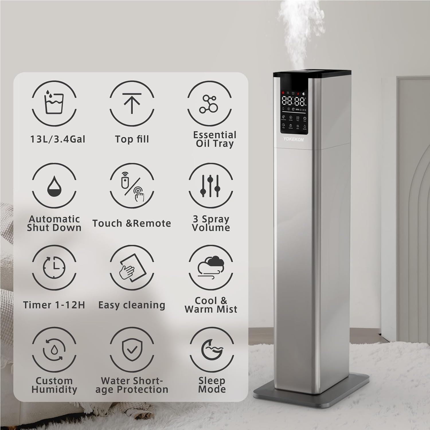💦 𝗟𝗼𝗻𝗴𝗲𝘃𝗶𝘁𝘆 & 𝗘𝗻𝗵𝗮𝗻𝗰𝗲𝗱 𝗖𝗼𝘃𝗲𝗿𝗮𝗴𝗲 𝗛𝘂𝗺𝗶𝗱𝗶𝘁𝘆: Transform your spacious environment, up to 1000 sq.ft., including bedrooms, living rooms, offices, and greenhouses, with our 3.4Gal/13L floor humidifier. Combat dry air concerns and bask in the benefits. Experience up to 48 hours of continuous mist for a calming ambiance adored by your family, baby, or pets. Discover ultimate ease with dual control options: an intuitive LED touch panel and a convenient remote control.