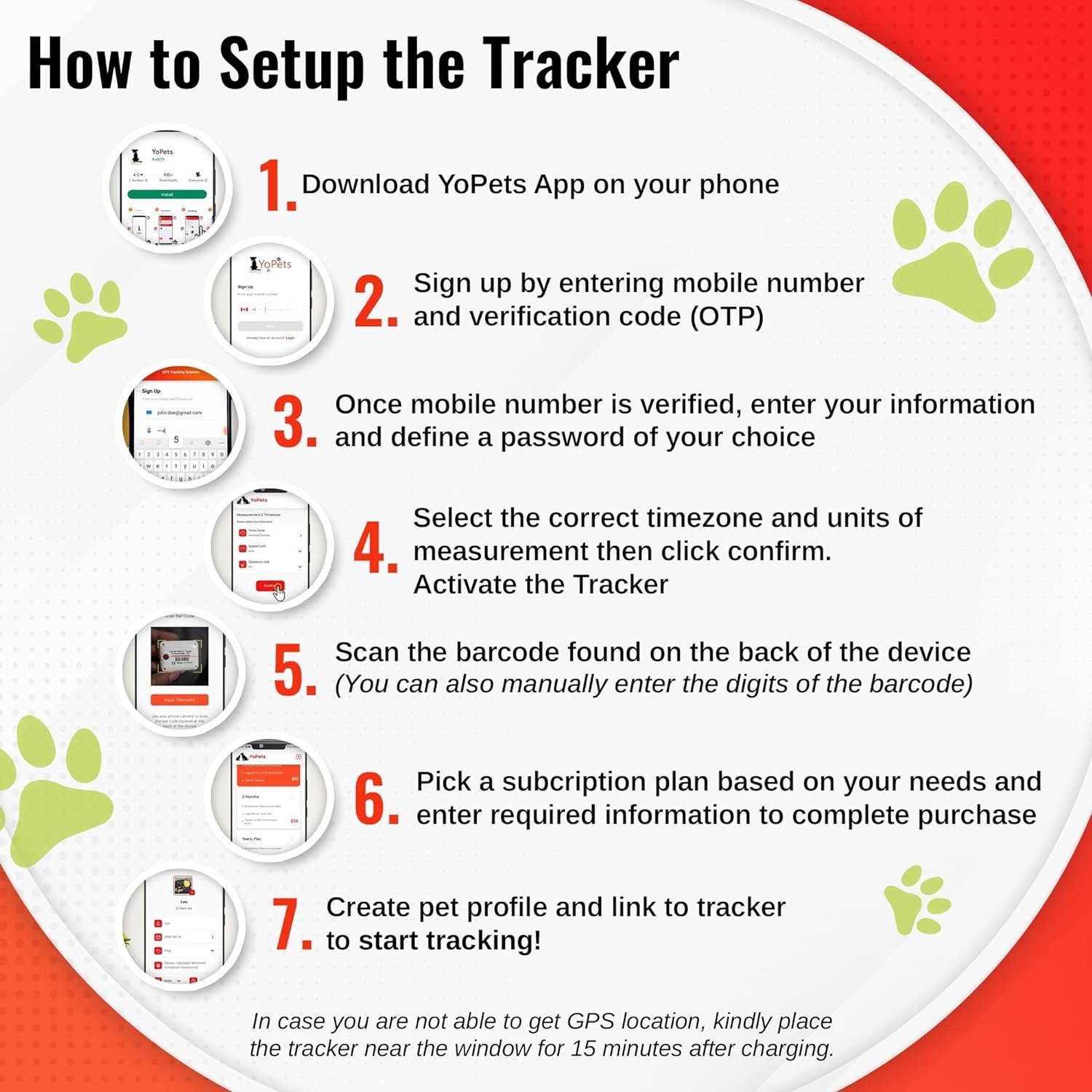 Charge the tracker for 1.5 hours.Download the YoPets app on your phone & Sign Up.Slip the tracker onto your pet’s collar.