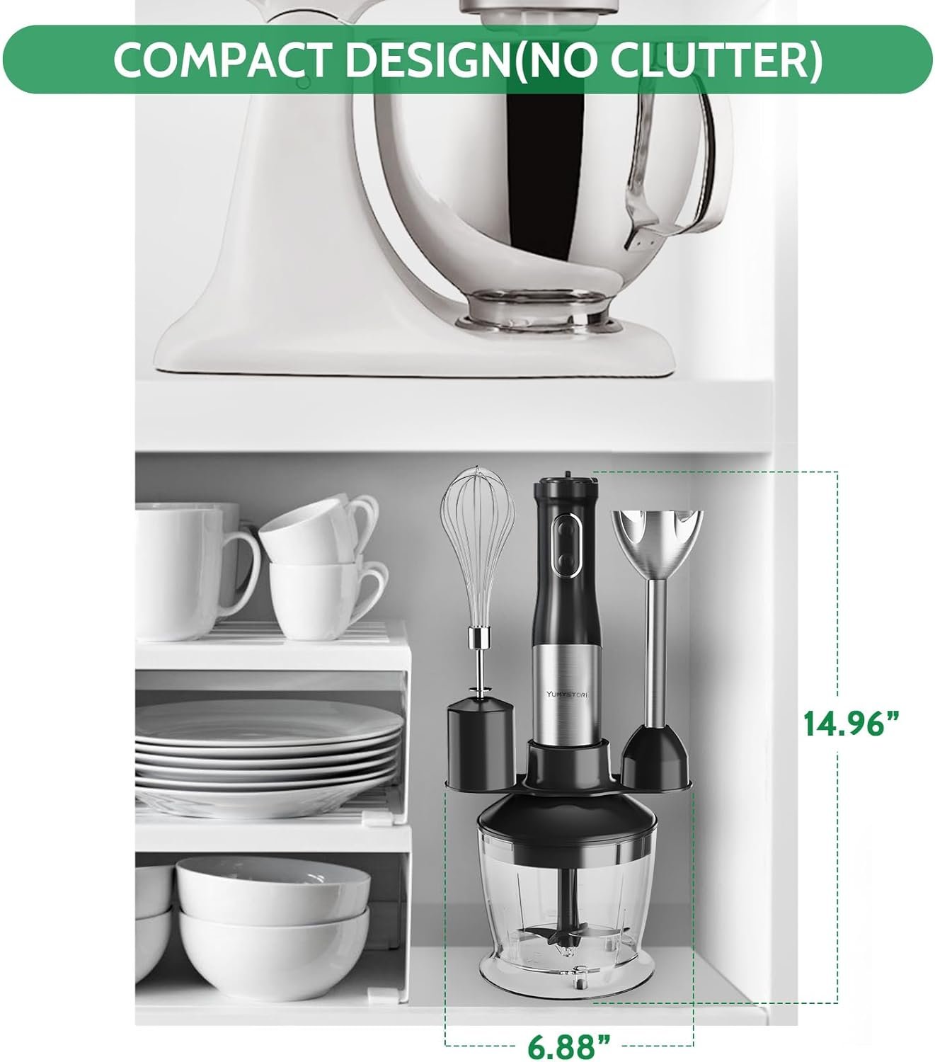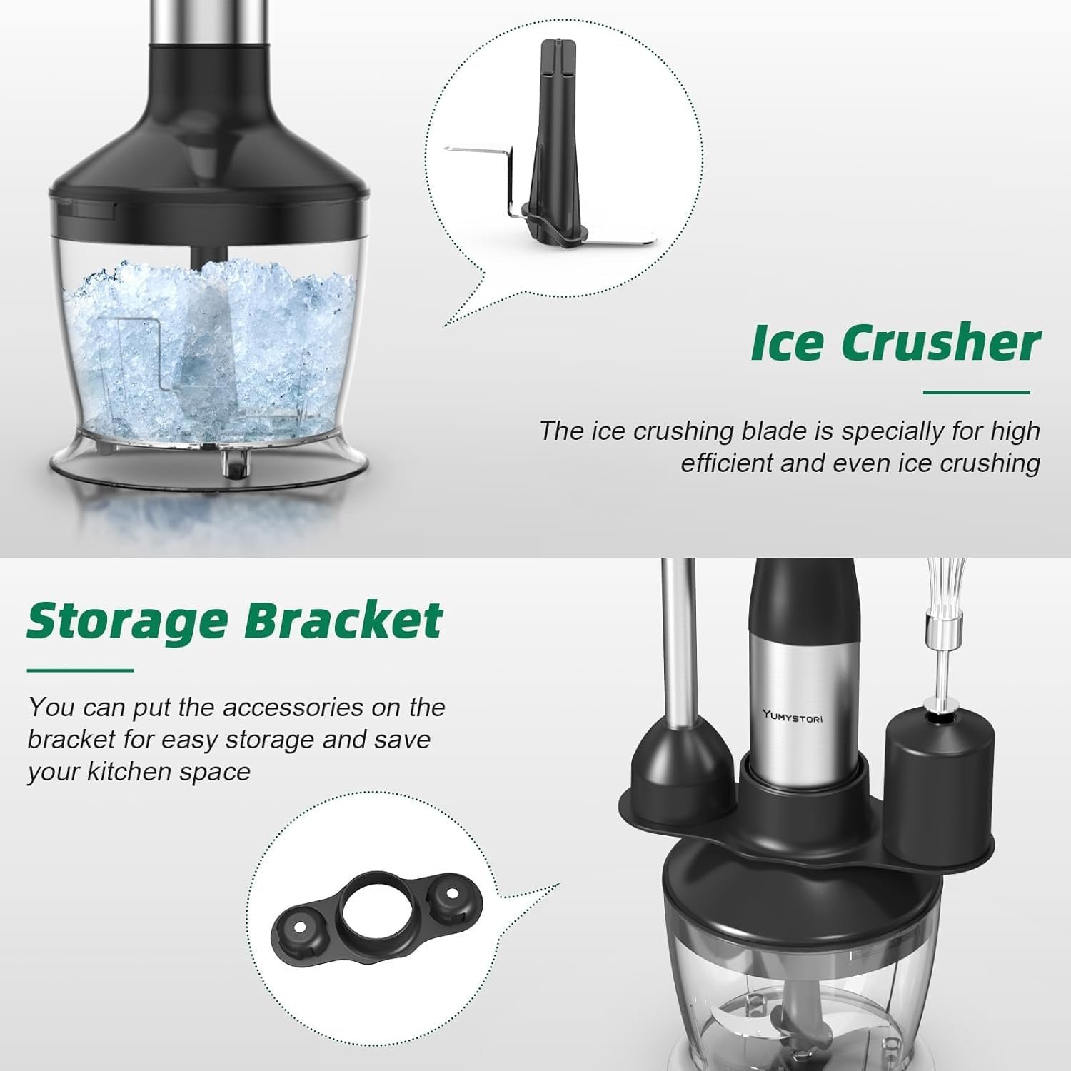 Bracket and Hook Design: Yumystori immersion blender handheld are equipped with storage bracket and hook design, You can put the accessories on the bracket or hang it on the wall for easy storage and save space.