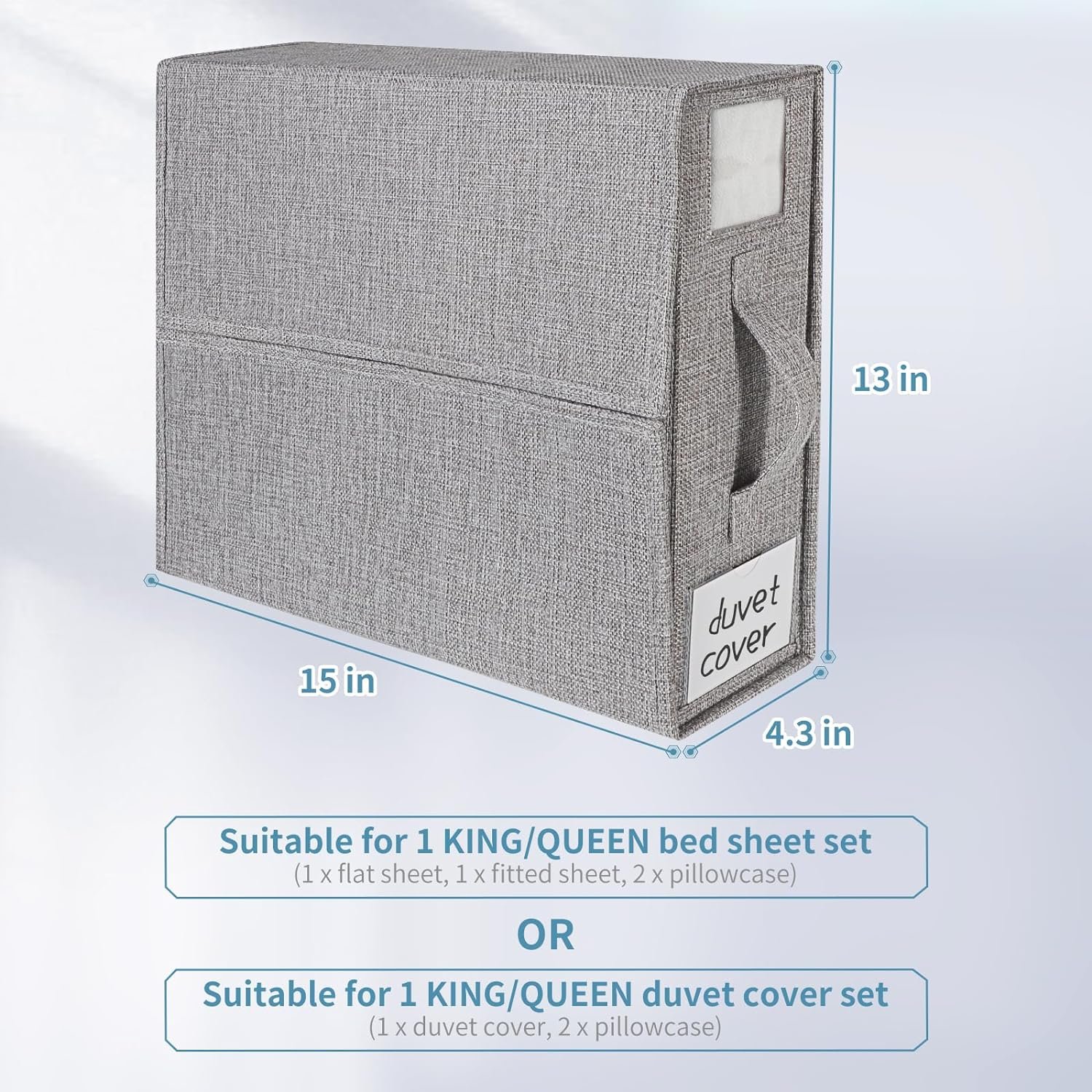 Convenient and Portable: No need to open the bed sheet organizer to see what’s inside. Label to identify which bed sheet belongs to. Window to see the color and pattern of the linen. Handle to remove this bed sheet organizer easily.