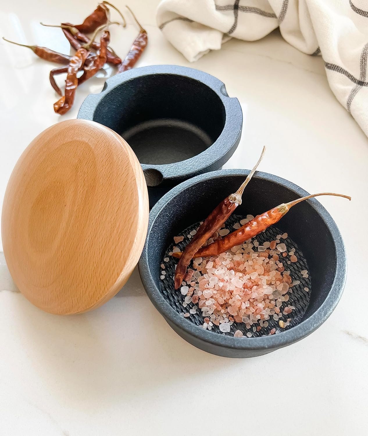 FUNCTIONAL STYLE: This attractive, functional, high quality grinding set will live permanently on your countertop because you will use it often. This manual spice grinder comes with 3 pieces: the outer cup, the inner grinder, and the lid. The bowl and grinder are made of traditional cast iron, and the lid is made of beech wood and a silicone seal to securely store ground spices, herbs, and seeds. Place herbs or spices in the cup and twist to grind, pour into the outer cup, then put the lid on top to store.