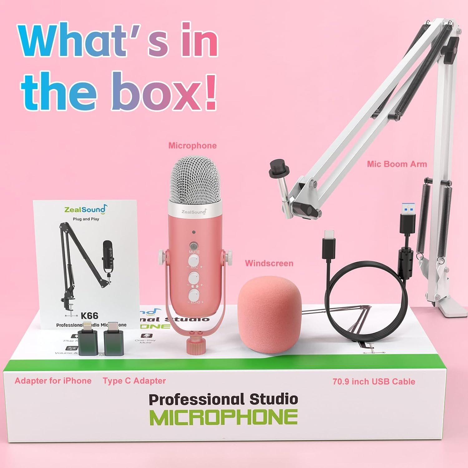 【Podcast Equipment Bundle】With the K66 microphone kit and podcast equipment bundle, you’ll never spend more for accessories. You’ll receive 1 x heavy-duty professional K66 recording microphone; 1 x 70.87-inch USB Audio cable; 1 x Type C adapter for the newest MacBook and all other Type C devices (phone, tablets, and PC); 1 x USB Adapter for iPhone and iPad; 1 x Microphone foam windscreen; 1 x Mic clamp (max 1.8 inches); 1 x Mic arm; 1 x User manual; 1 × 3.3inW x 2.9inH Furry Windscreen Cover.