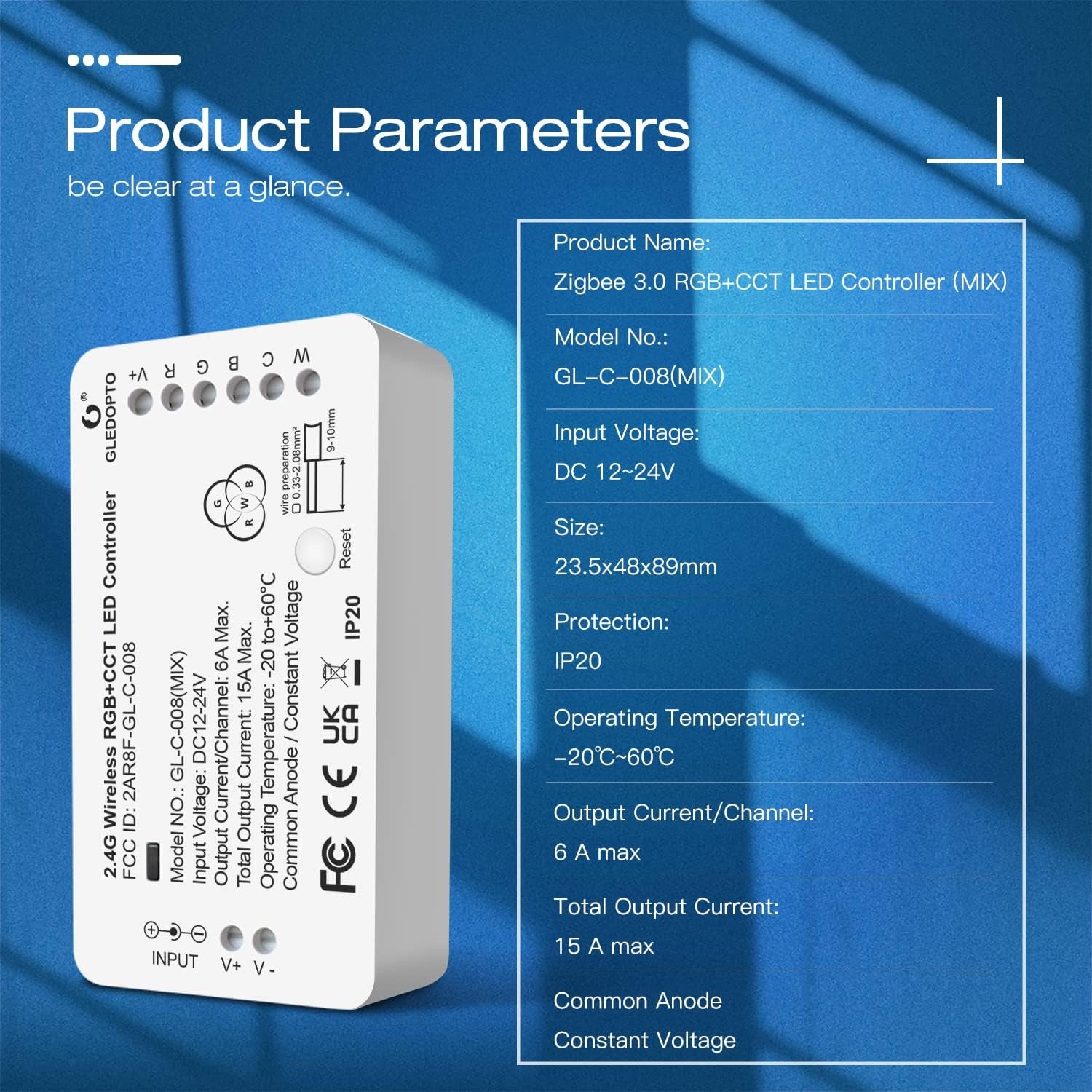 Product name: ZigBee RGB+CCT LED Controller MixInput Voltage: DC12-24VSize: 3.5*1.89*0.9inchOutput Current/Channel: 6 A maxProtection rate: IP20Total Output Current: 15 A maxOperating Temperature: -20℃~60℃Common Anode/Constant Voltage