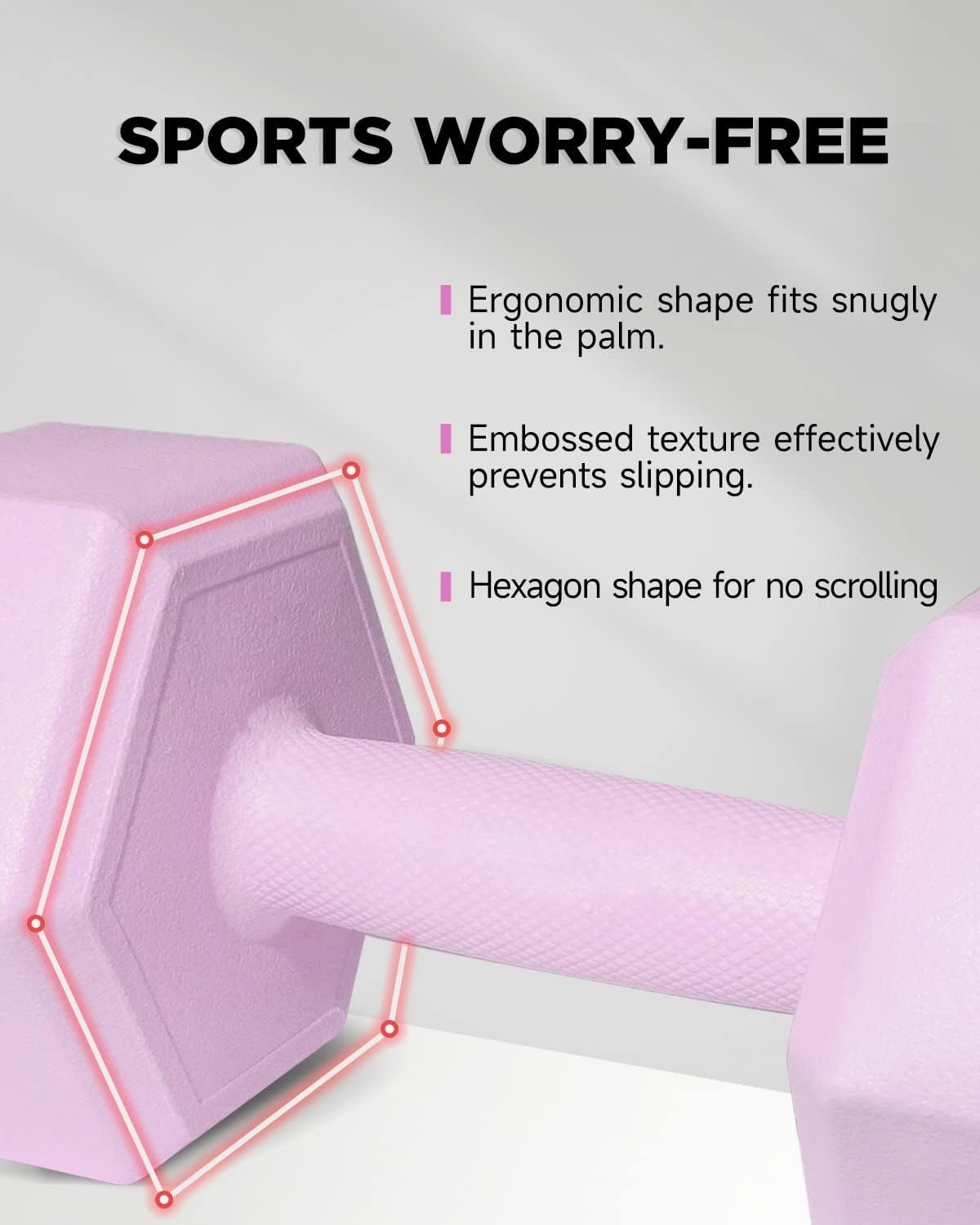 [NO SCROLLING] Our dumbbells feature a hexagonal design with a textured PVC surface so you don’t have to worry about rolling while stacking and doing floor moves.
